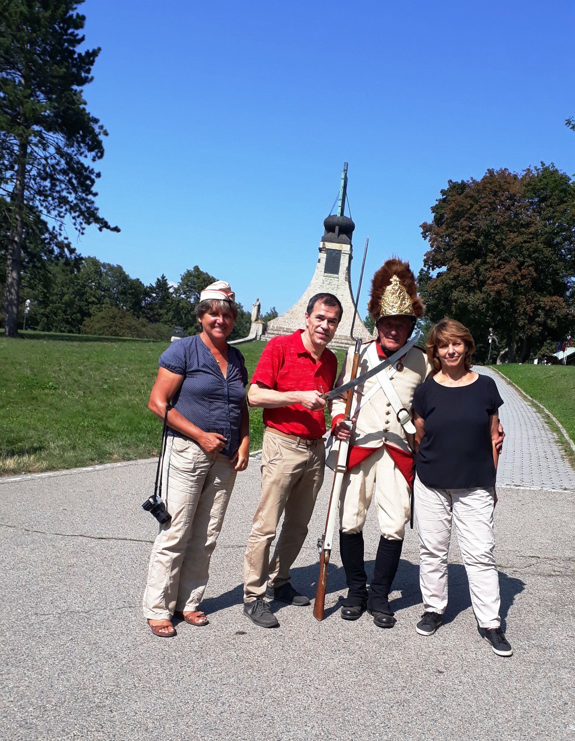 Hierzu reiste Ende August 2019 Uwe Ridinger für einige Tage ins mährische Brünn (Tschechische Republik) und erkundigte mit sachkundigen Führerinnen vom Brünn- Tourismus das ausgedehnte Schlachtfeld zwischen Brünn und Austerlitz. Mit Helena (englisch) und Maruschka (deutsch) wurde dabei ein Tag lang die historische Gegend mit mehreren markanten Punkten bereist. So sind besonders sehenswert das Schloss in Austerlitz mit einer großen Ausstellung von Uniformen und Waffen von dieser Schlacht, die auch in die Hand genommen werden durften, und das Friedensdenkmal auf dem Pratzenberg als weitere große Gedenkstätte. Dort traf Uwe Ridinger mit seinen Reiseleiterinnen Helena und Maruschka auf einen österreichischen Grenadier von 1805.